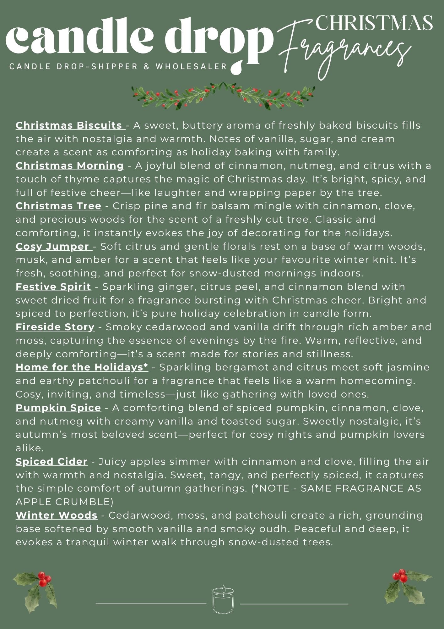 - Christmas Biscuits - A sweet, buttery aroma of freshly baked biscuits fills the air with nostalgia and warmth. Notes of vanilla, sugar, and cream create a scent as comforting as holiday baking with family. (*NOTE - SAME FRAGRANCE AS VANILLA)